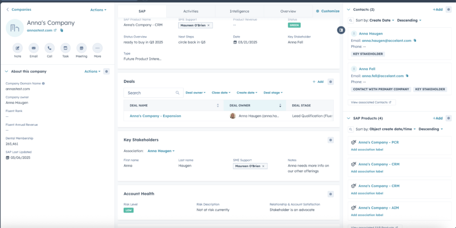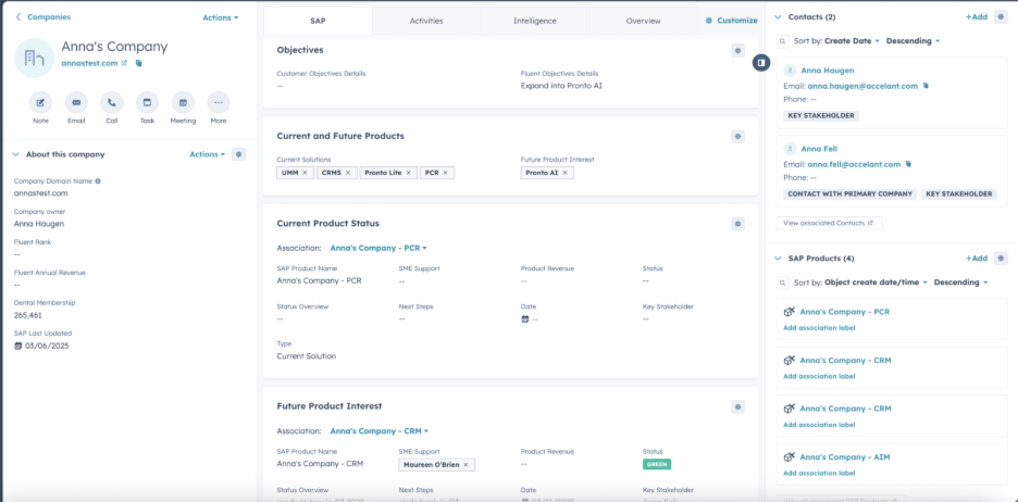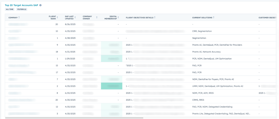 accelant built a custom object—SAP (Strategic Account Planning)—to house all of the client’s critical ABM data directly in HubSpot. Instead of manually updating spreadsheets, reps now use a unified dashboard to: